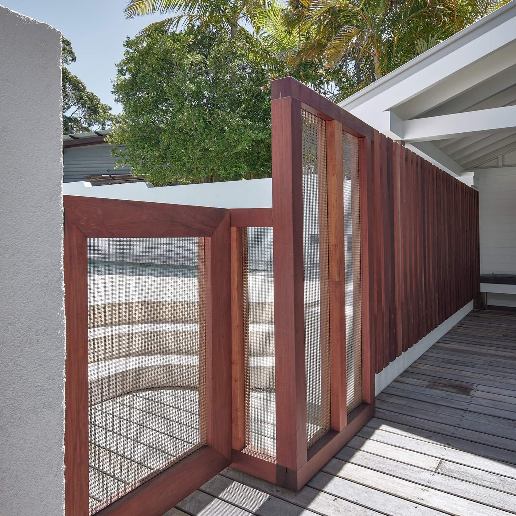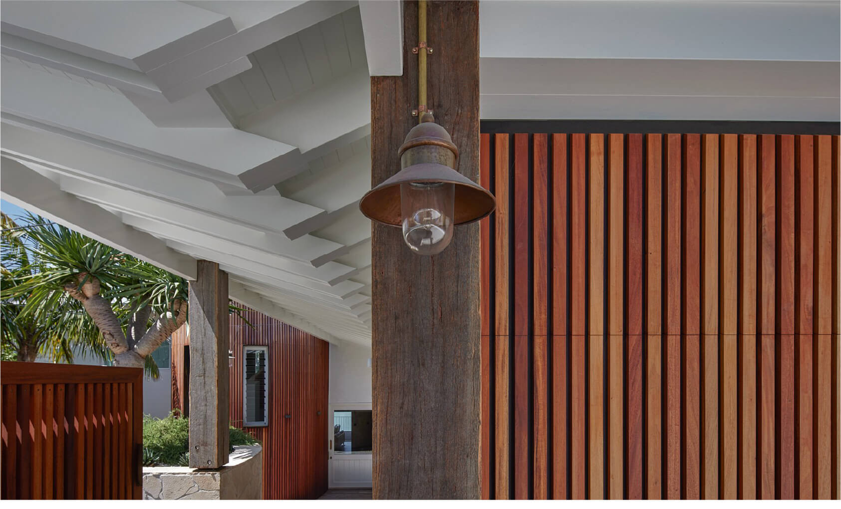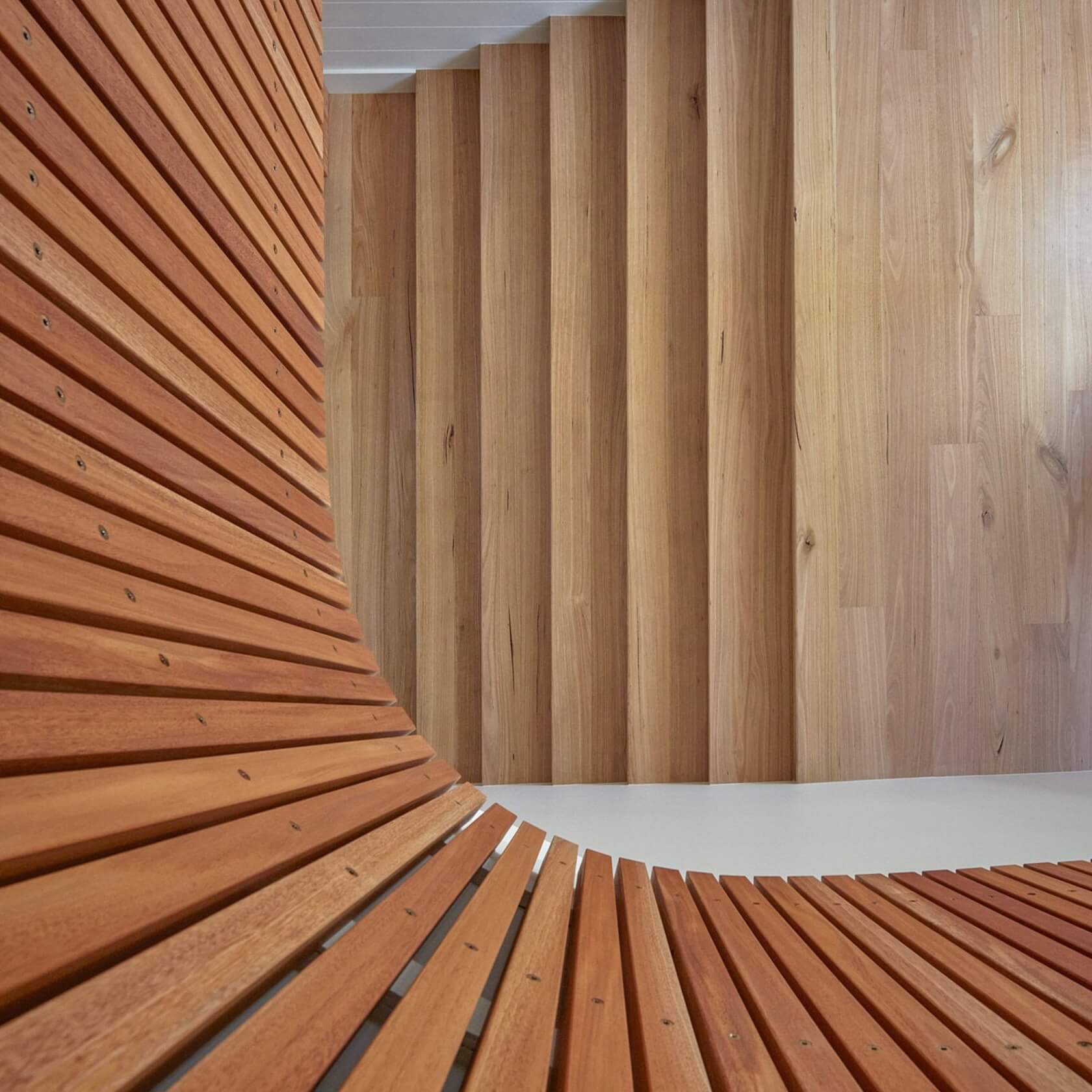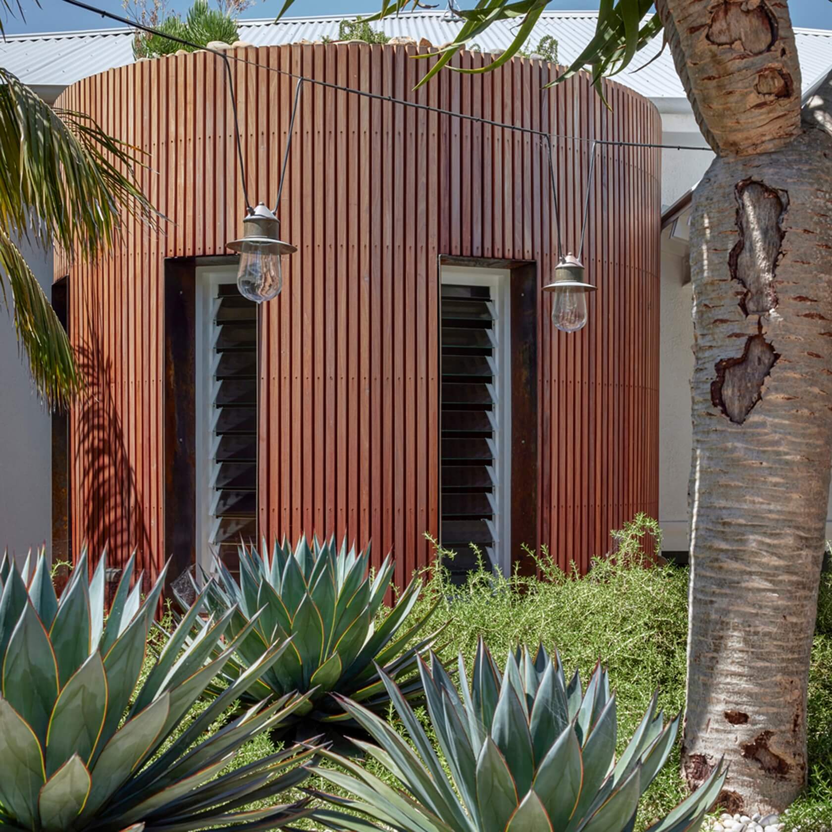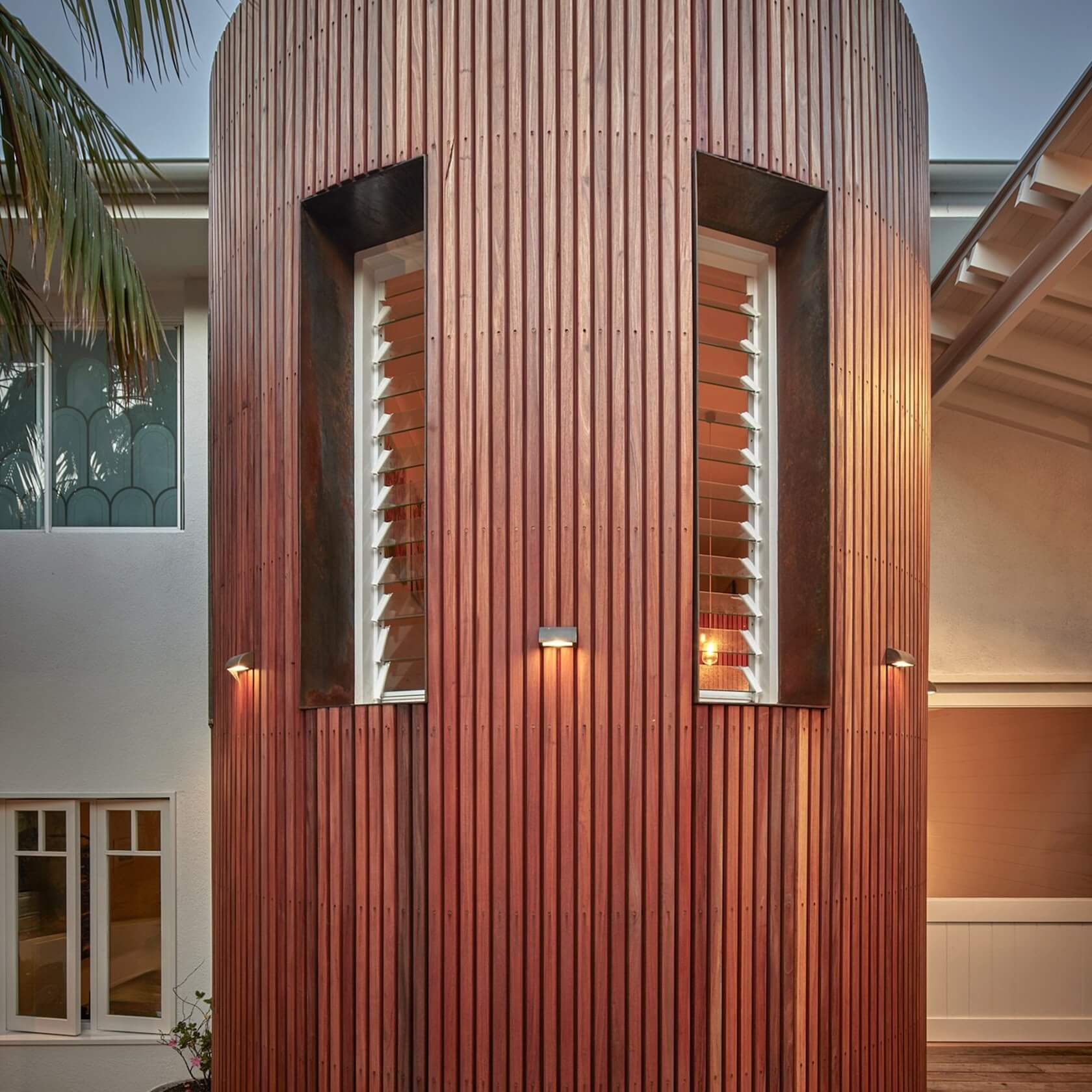 - Exterior curve feature – Fijian Mahogany custom profile castellation cladding.