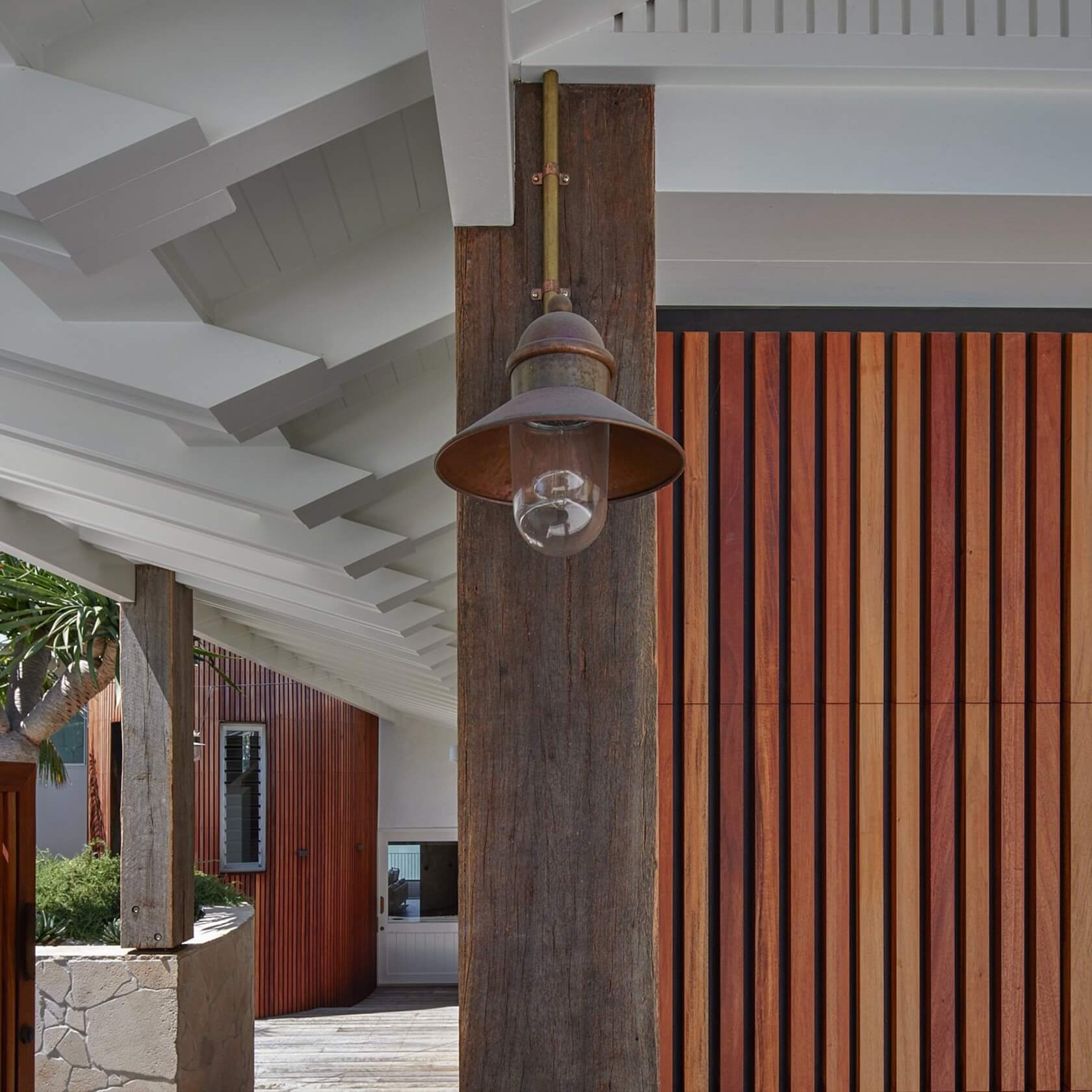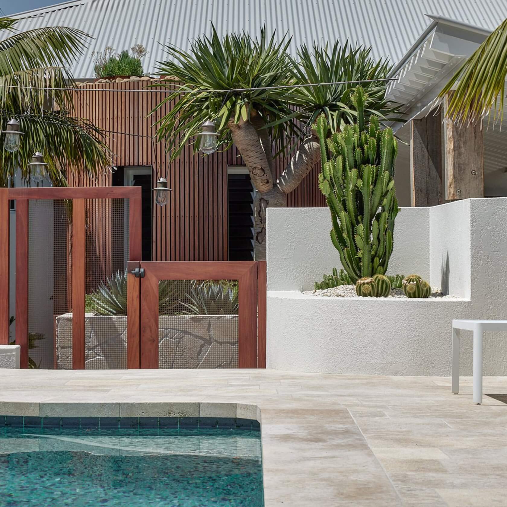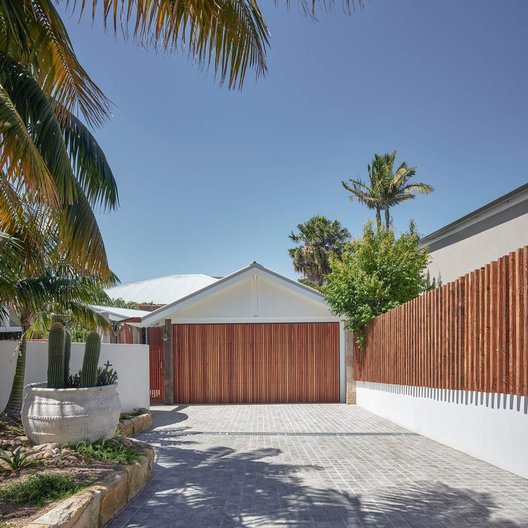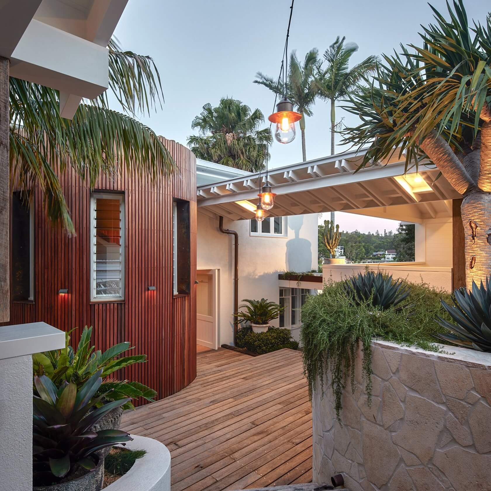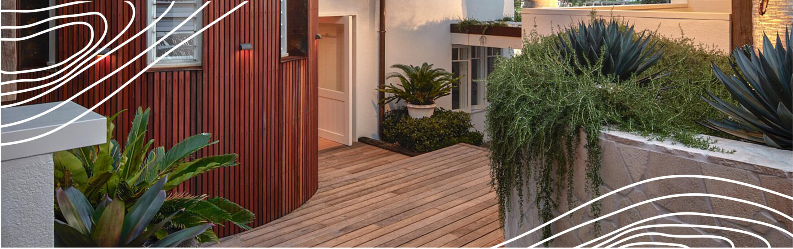 - Exterior curve feature – Fijian Mahogany custom profile castellation cladding.